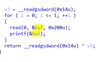 已知 Canary 储存在 TLS 中,在函数返回前会使用这个值进行对比。当溢出尺寸较大时,可以同时覆盖栈上储存的 Canary 和 TLS 储存的 Canary 实现绕过。
