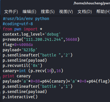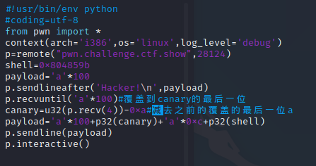 之后,计算好偏移,将 Canary 填入到相应的溢出位置,实现 Ret 到 getshell 函数中