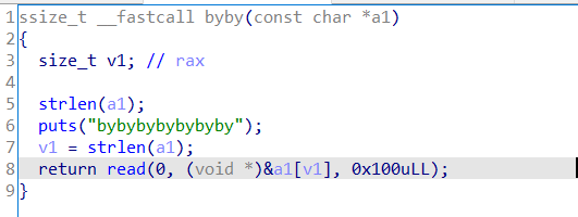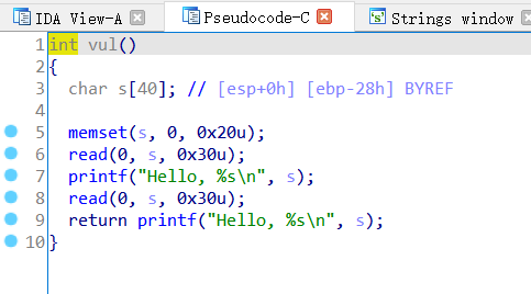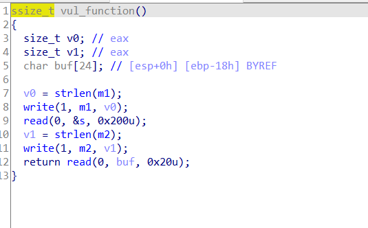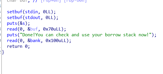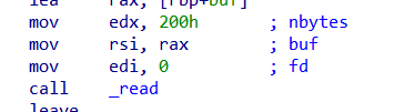 这里总共输入了两次数据,同时还能printf出来,可能会泄露一些重要地址信息。这里的read函数全部被限制到只够刚好覆盖到返回地址就不能再继续填充了,所以这里是用了栈迁移的思想,把栈迁移到栈上,制造一个假栈。