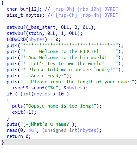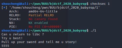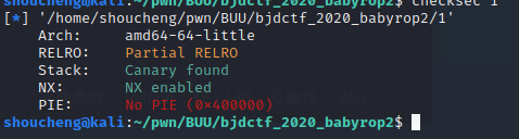 十二、bjdctf_2020_babyrop 例行checksec一下,然后运行一下。开启了nx和部分relro缓解机制。运行的结果也不能看出些什么,进入ida看看吧