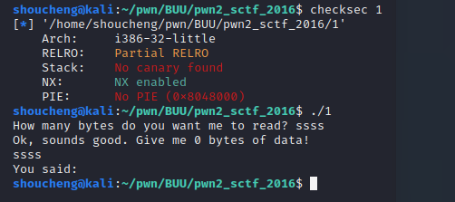 十四、pwn2_sctf_2016 例行checksec并且运行,只开启nx和部分的relro,拖入ida查看一下代码