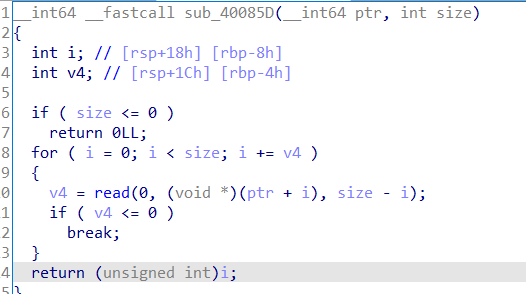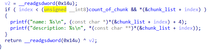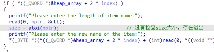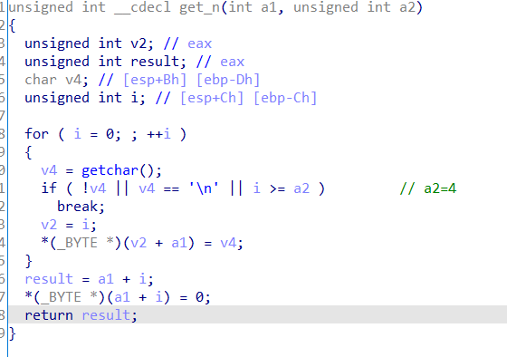 接下来讲下漏洞点:main函数里面定义的v2是int类型的,而在get_n里面却是unsigned的,这里如果我们输入了一个负数,那么在get_n里面将变得非常大,足够我们溢出了。