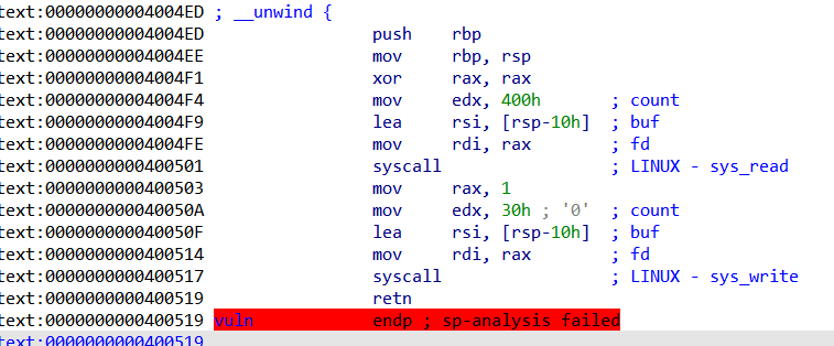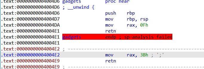 main函数里面很简单,两个系统调用就没了,而有系统调用,那就去看看汇编代码。汇编代码前两行要注意,这里的rsp没有减少,在这题里面rsp=rbp了,后面计算偏移不可以把rbp覆盖了。左边的函数栏看一下,有个gadget的,进入查看