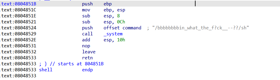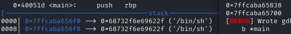 而系统函数附件中已经有了system的调用,差的就只有/bin/sh的字符串了,我们可以直接写在栈上,然后仍然是用泄露出来的地址算出/bin/sh地址,作为参数即可
