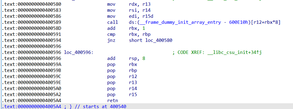 这边csu里面的edi是有问题的,因为/bin/sh的地址是不止4个字节,所以edi是不够盛放的,所以我们需要rdi才行,这边使用了ROPgadget去寻找。所以后面payload构造rop时,这边还需要利用r12盛放栈上的内容进行跳转到栈上继续执行,而不能直接就在r12里面存放syscall地址进行直接调用。