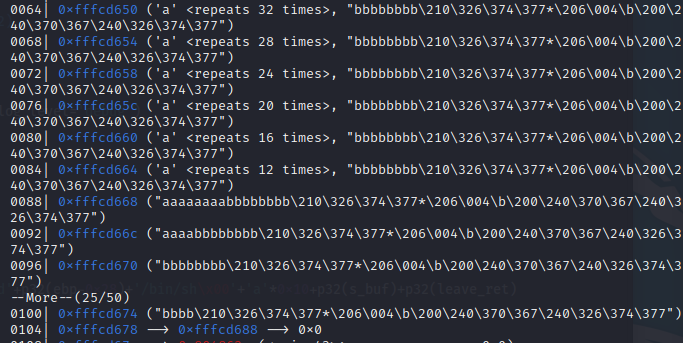 最顶上0xfffcd65就是s的位置,而0xffcd678就是ebp指向的位置,而在该地址处的内容为0xfffcd688就是我们泄露出来的内容,与s偏差为0x38