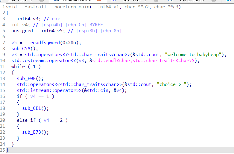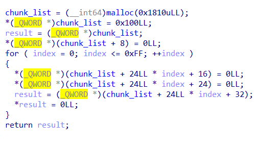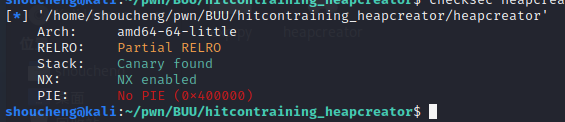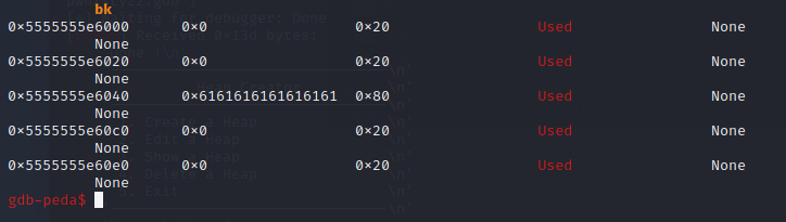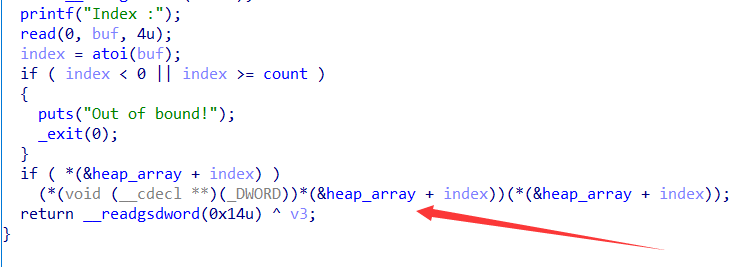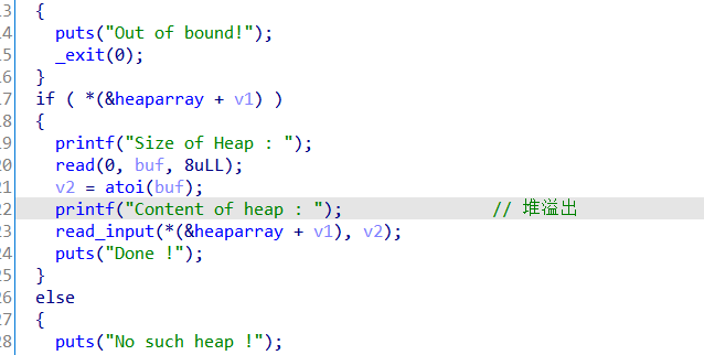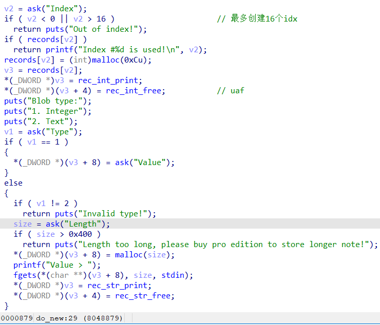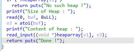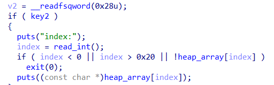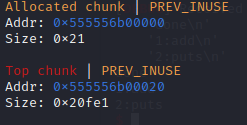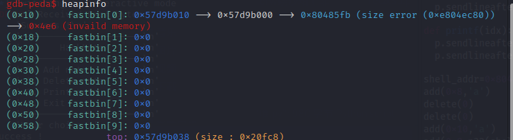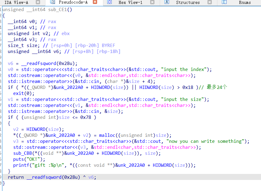 最多可以创建二十四个不同的索引,堆的大小最大不能超过0x78,被限制只有fast chunk大小,然后我们在创建之后还能往堆上输入数据,最后,printf了堆的地址出来。