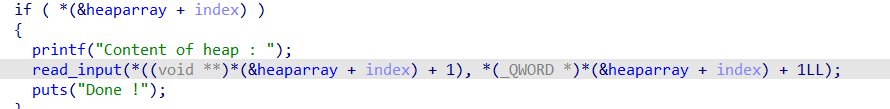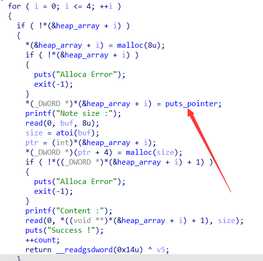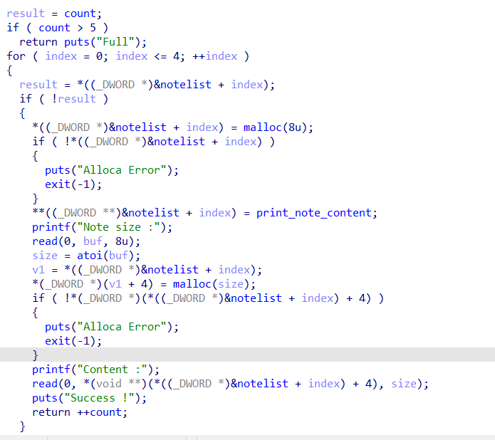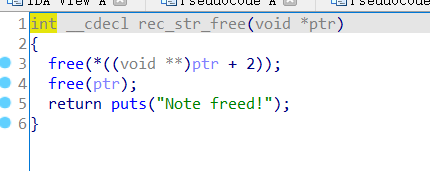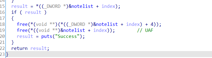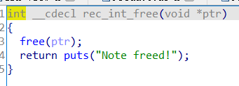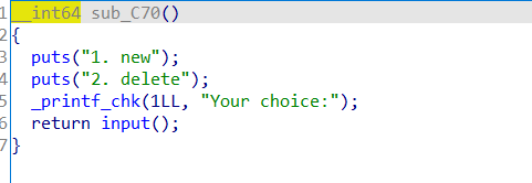 在申请堆块功能里,发现一个有意思的东西,把一个调用puts的函数的地址赋值给了堆块内容,猜测打印功能就是直接使用这个函数指针,那么就可以试着修改这个指针,改为system,再把堆块内容修改为/bin/sh