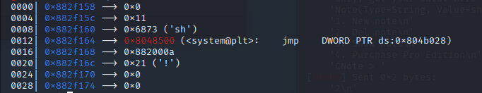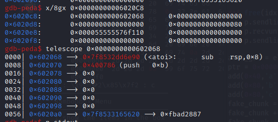 在函数表里面,我们可以看见,system函数被调用过了,也就是接下来就是/bin/sh以及调用的问题,这里我们选择在函数指针做手脚,因为函数指针未置空,我们只需要把free函数指针改为指向system的地址,然后再对释放的内容修改为/bin/sh的地址,就能让调用free(ptr)变成system(“/bin/sh”),这边由于输入长度问题,写的是/sh字符串。