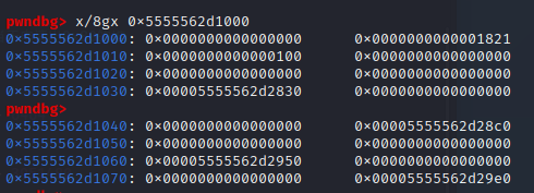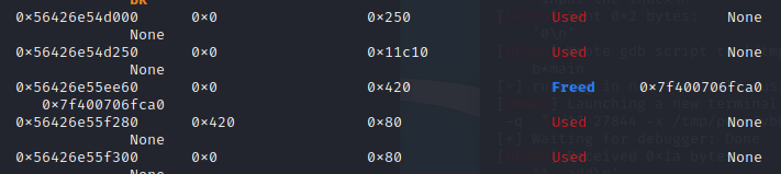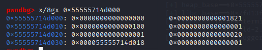 释放完后出现了libc中的地址,接下来就泄露了。因为题目里面只能泄露出堆块的地址,所以我们要想办法让在这个地址申请chunk。这边因为这个0x420的chunk是由许多chunk合并的,我们把chunk1释放了,再申请一个大小和chunk0一样的堆块,就可以让chunk1能够重叠在fd的位置