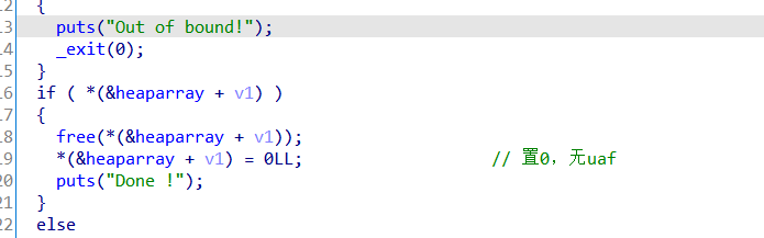 释放掉索引对应的堆块,并且可以发现,并未将堆指针置空,存在uaf漏洞。在找找其他地方,发现没有存在后门函数。那只能走泄露libc了,然后劫持hook函数。