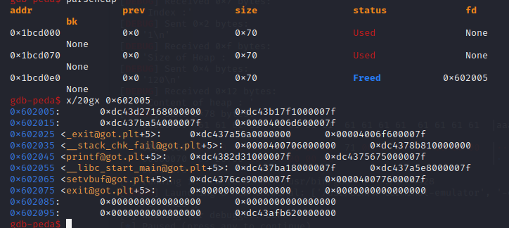 这题问题点在于构造overlap时,要进行合并的头堆块和尾堆块中间要夹着至少两个堆块(一个堆块会报错,刚开始我就一直卡着)。