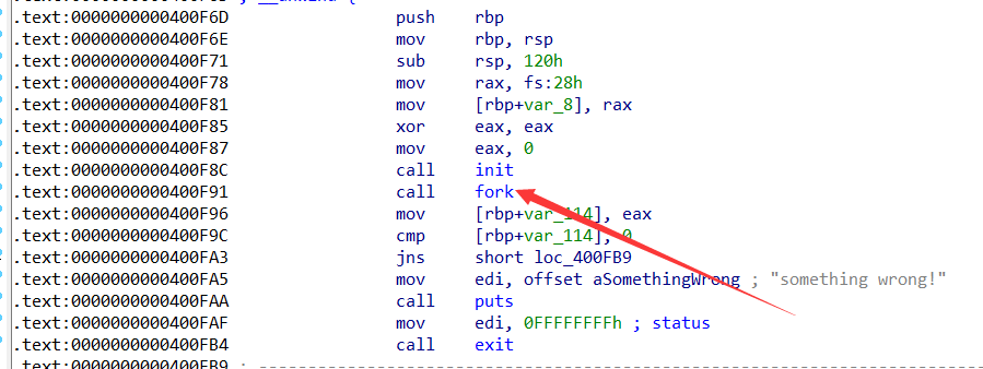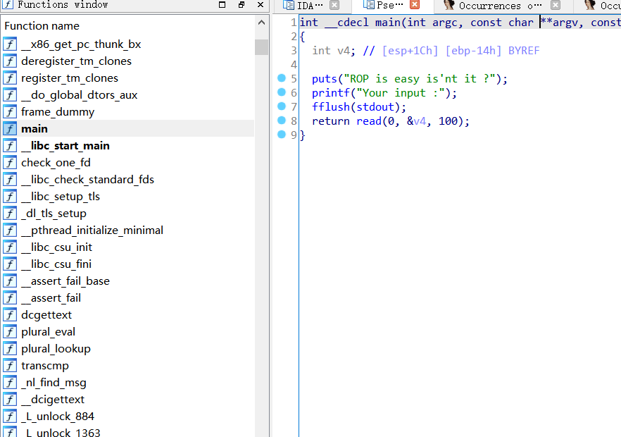 出现了一堆乱码,可能是地址泄露了?进入ida看看情况如何