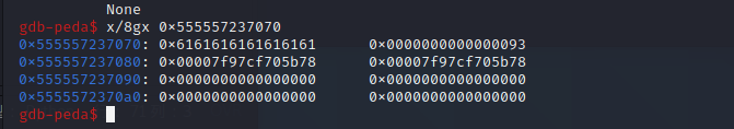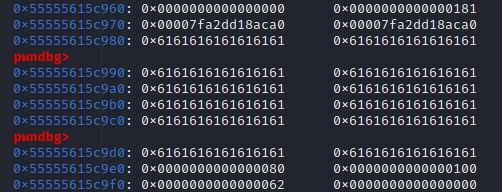 然后我们就要去修正前面为了占位置的垃圾的数据了,这边我用的是a这个字符。清空是用了前面强调的delete填充垃圾数据是根据我们申请堆块时候写进去的size填充的,所以如果我们依次减少一个字节申请数量,然后再填满我们申请的大小,借用strcpy溢出的’\x00’来逐个去清空前面为了修改pre_inuse位而填入的a