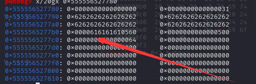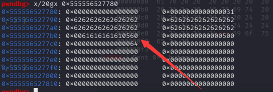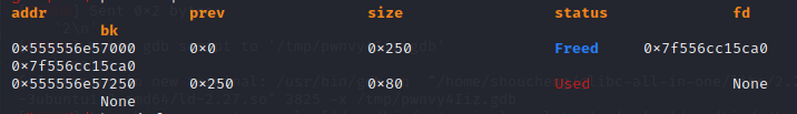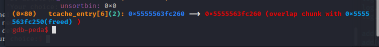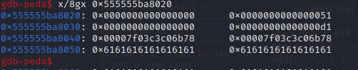 这边要注意,因为是glibc-2.27版本,所以堆块是要申请入0x4f8这样的,不会被放入tcache里面,才能实现合并。然后就是pre_size位置的填充一定要把那个八个字节的内容都要填满才行