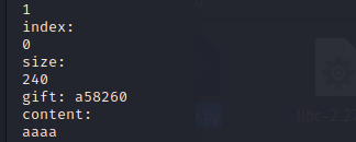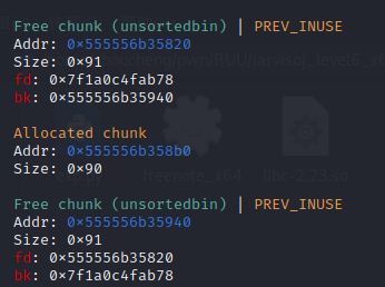 第一步是获取libc,我的做法是借着释放unsorted chunk产生libc,然后再申请回来,覆盖fd指针为aaaa作为定位,然后将bk指针打印出来