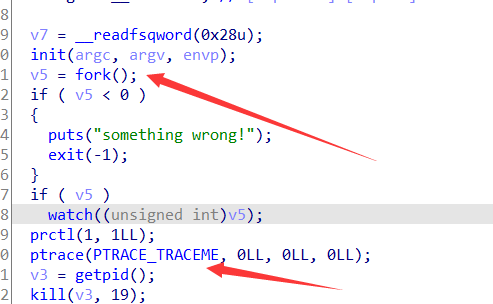 似乎无法调试这题,去百度了一下https://blog.csdn.net/seaaseesa/article/details/105855306,原来前面的代码都是为了让我们无法调试的。`ptrace` 提供了一种机制使得父进程可以观察和控制子进程的执行过程。父进程 fork() 出子进程,子进程中执行我们所想要 trace 的程序,在子进程调用 exec() 之前,子进程需要先调用一次 ptrace,以 PTRACE_TRACEME 为参数。