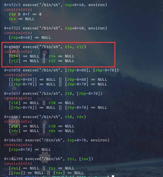 禁用的只是常见的one_gadget,可以增加参数--level 2查看更多的one_gadget,但是约束更多,而其中上图圈出的也是可以getshell的one_gadget