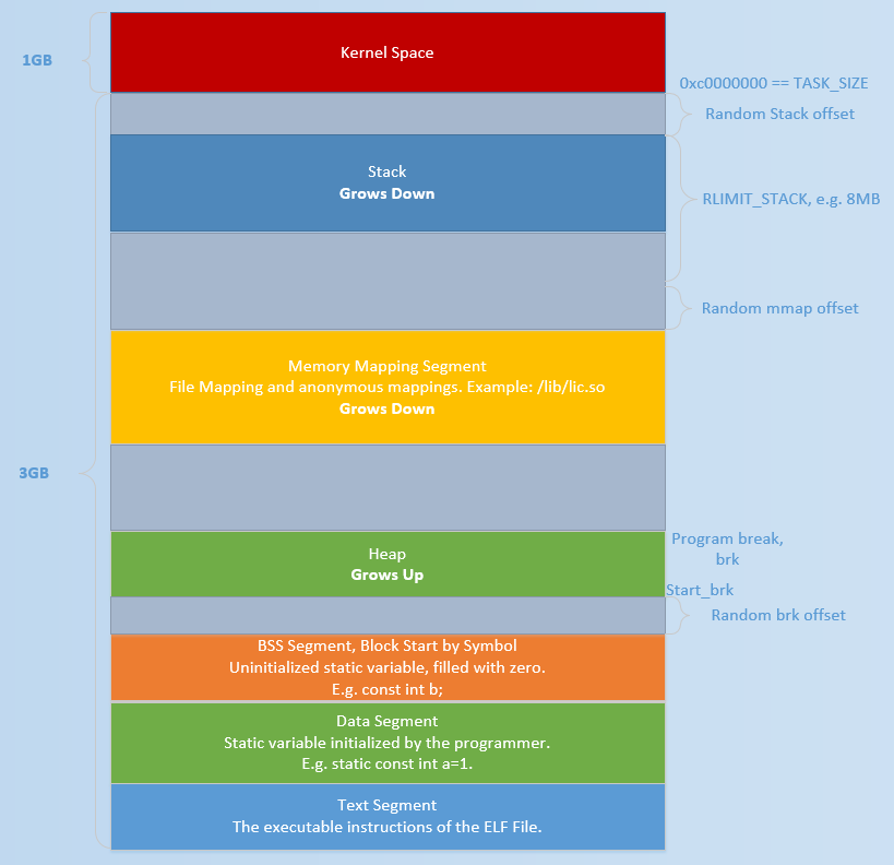 - 开启 ASLR 保护时,start_brk 以及 brk 也会指向同一位置,只是这个位置是在 data/bss 段结尾后的随机偏移处。
