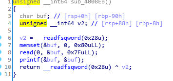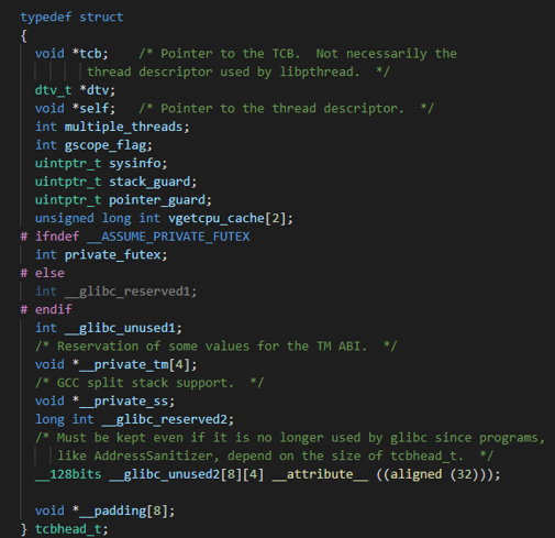 被取出来的 随便查看一个64位的程序,可以看到是从fs指向的位置加上0x28偏移的位置取出来的 而初始化canary时,fs寄存器指向的位置就是TLS结构体img 这个被定义在glibc/sysdeps/x86_64/nptl/tls.h中结构体tcbhead_t就是用来描述TLS的img img 以上是libc_start_main关于canary生成的过程,_dl_random是内核提供的随机数生成器 fs指向的位置加上0x28偏移处的变量uintptr_t stack_chk_guard就是canary的值