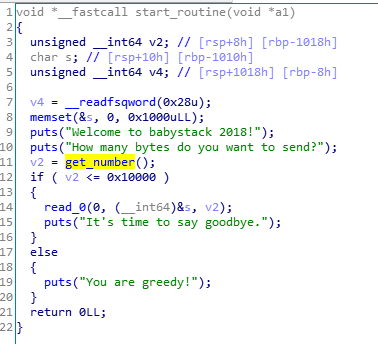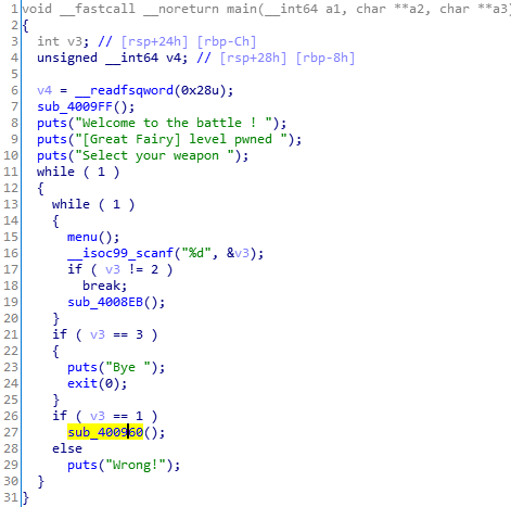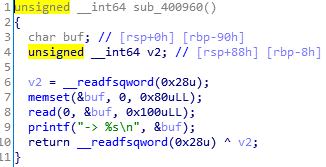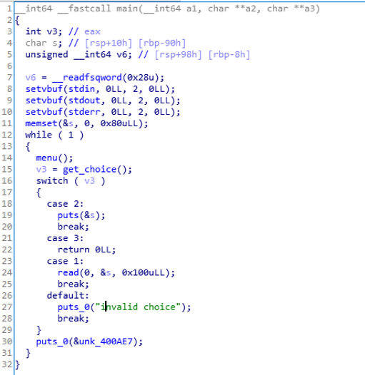 1 2 3 4 5 6 7 8 9 10 11 12 13 14 15 16 17 18 19 20 21 22 23 24 25 26 27 28 29 30 31 32 33 34 35 36 37 38 39 40 41 42 43 44 45 __int64 __fastcall main(__int64 a1, char **a2, char **a3) { __WAIT_STATUS stat_loc; int v5; __int64 v6; __int64 v7; char buf[48 ] ; char s2[56 ] ; unsigned __int64 v10; v10 = __readfsqword(0x28u) ; v7 = 3L L; LODWORD(stat_loc .__uptr ) = 0 ; v6 = 0L L; sub_4009A6() ; HIDWORD(stat_loc .__iptr ) = open ("./flag.txt" , 0 , a2); if ( HIDWORD(stat_loc .__iptr ) == -1 ) { perror("./flag.txt" ); _exit(-1) ; } read(SHIDWORD(stat_loc .__iptr ) , buf, 0x30 uLL); close(SHIDWORD(stat_loc .__iptr ) ); puts("This is GUESS FLAG CHALLENGE!" ); while ( 1 ) { if ( v6 >= v7 ) { puts("you have no sense... bye :-) " ); return 0L L; } v5 = sub_400A11() ; if ( !v5 ) break; ++v6; wait((__WAIT_STATUS)&stat_loc); } puts("Please type your guessing flag" ); gets(s2); if ( !strcmp(buf, s2) ) puts("You must have great six sense!!!! :-o " ); else puts("You should take more effort to get six sence, and one more challenge!!" ); return 0L L; }