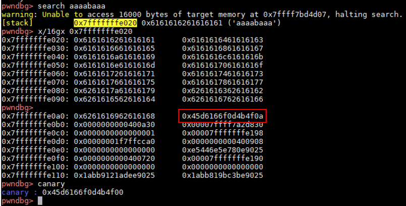 覆盖低字节泄露Canary 有些存在溢出漏洞的程序,在要求我们输入字符后,会将我们输入的字符打印出来,而canary的最低位是\x00,是为了让canary可以截断输入的字符。我们可以利用溢出,多覆盖一个字节,将\x00给覆盖掉,那么canary就会和我们输入的字符连起来,那么,程序打印时没有检查打印字符的长度的话,就可以连带着Canary打印出来了,然后再次溢出,将泄露出的canary填入原来的位置,就可以覆盖到返回地址了