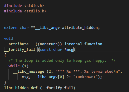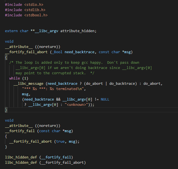 warn 需要注意的是,这个方法在glibc2.27及以上的版本中已失效 我们继续分析2.27的源码img img 可以看到,执行__fortify_fail_abort函数时多传入了一个need_backtrace参数,而整个参数在前面就已经写死成false了,所以执行__libc_message函数时,第二个参数也被写死成了””字符串,打印不了栈中的信息了