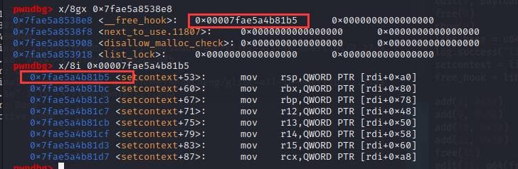 然后根据setcontext+53上的寄存器布置环境:而rdi的值是我们等下要释放的堆块的地址,根据这个计算出偏移,在对应的地址为rdi,rsi,rdx设置参数,然后设置rcx的值为mprotect的地址,去执行mprotect,再跳转回来执行shellcode读取flag