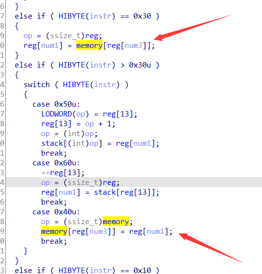 然后呢在分析虚拟机实现了哪些指令时,可以从下面两个大方向入手:首先找到虚拟实现的内存以及寄存器,比如程序可能单独malloc几块内存用来当作寄存器或者栈空间,亦或者就用全局变量来实现;第二步就是读代码逻辑,分析指令。有字符串,可以直接根据提示的字符串识别;没有字符串,则根据指令操作码和操作数构成,操作数的个数还可分为一操作数指令、两操作数指令以及三操作数指令等概念加入到代码逻辑的阅读中,帮助我们快速分析和理解。