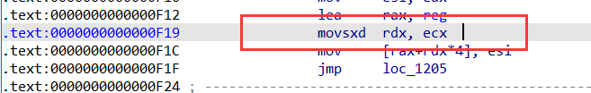 结合汇编一起看,可以发现,数组下标没有禁止为负数的情况,所以是可以向上访问到got表,从而把函数地址放入寄存器中,获得函数地址。但是这边要注意,寄存器跟内存是4字节的,而泄露的地址是6字节的,、所以要用两个寄存器分别存放高四字节和低四字节