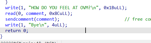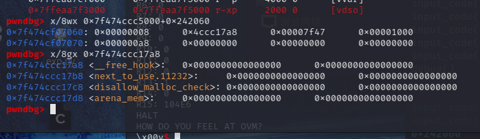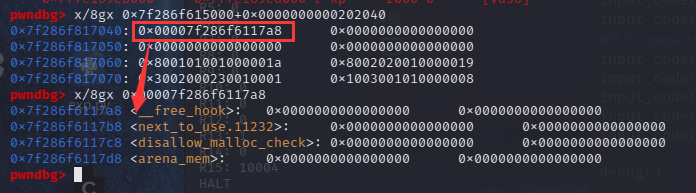 然后就是退出execute时,会往之前申请的堆块里面写入内容,再释放掉。但是因为这个堆块的地址是存放在.bss上的,在上面的数组越界同样可以修改,所以可以改为free_hook - 0x8,改为这个是因为我们要释放得是一块含有/bin/sh的堆块,所以要先有位置填充/bin/sh,然后再写入system函数。