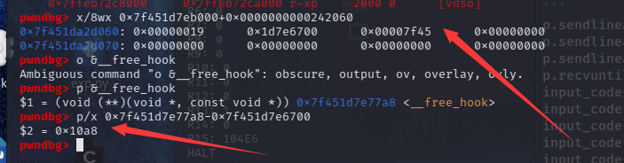 可以看见,一顿操作后,寄存器上确实存放了一个libc地址,计算与free_hook的偏移即可