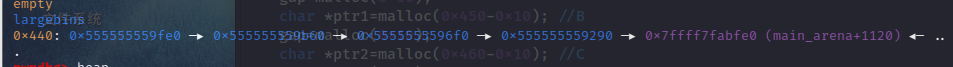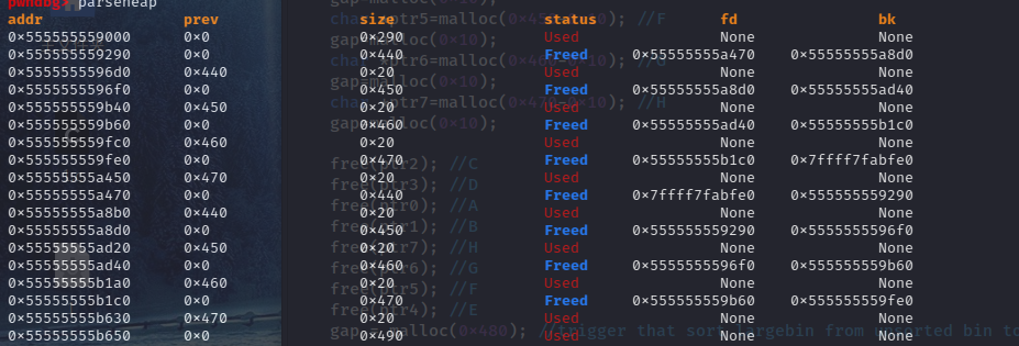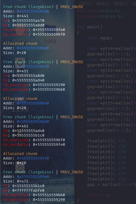 free(ptr2); //C free(ptr3); //D free(ptr0); //A free(ptr1); //B free(ptr7); //H free(ptr6); //G free(ptr5); //F free(ptr4); //E gap = malloc(0x480); //trigger that sort largebin from unsorted bin to largebins