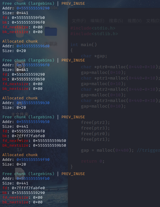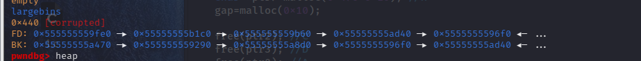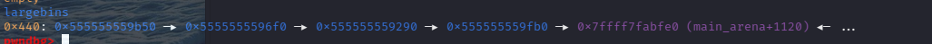 free(p1); printf("Free the larger of the two --> [p1] (%p)\n",p1-2); size_t *g3 = malloc(0x438); printf("Allocate a chunk larger than [p1] to insert [p1] into large bin\n");