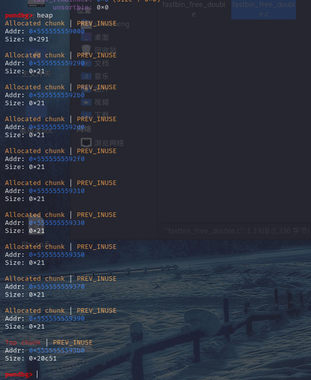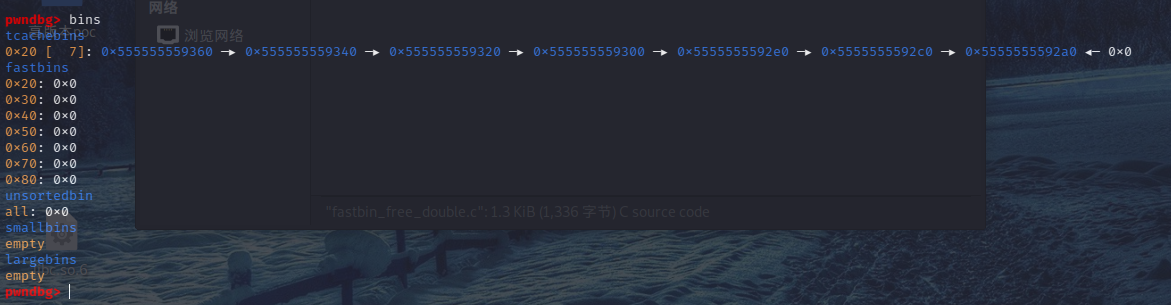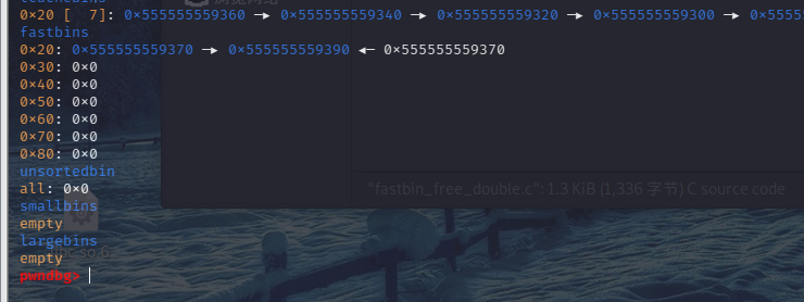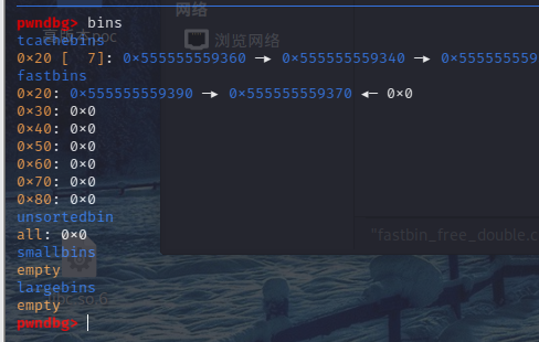 - 再释放两个堆块进入 fastbin,按照 p-q-p 的顺序释放,即可形成 double free。