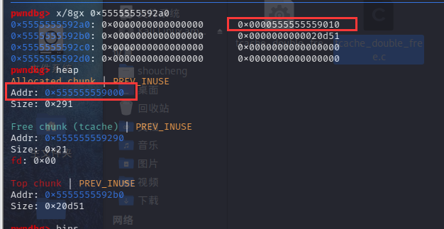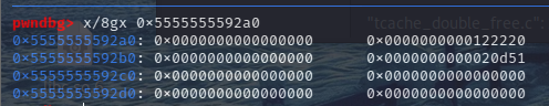 然后利用 UAF 再次释放合并进入到 unsorted bin 的堆块,造成了存在一个堆块即在 tcache 里,又在 unsorted bin 里。这里的堆块不能选择释放头部,因为那样会变成让 0x220 的堆块进入到 tcache。
