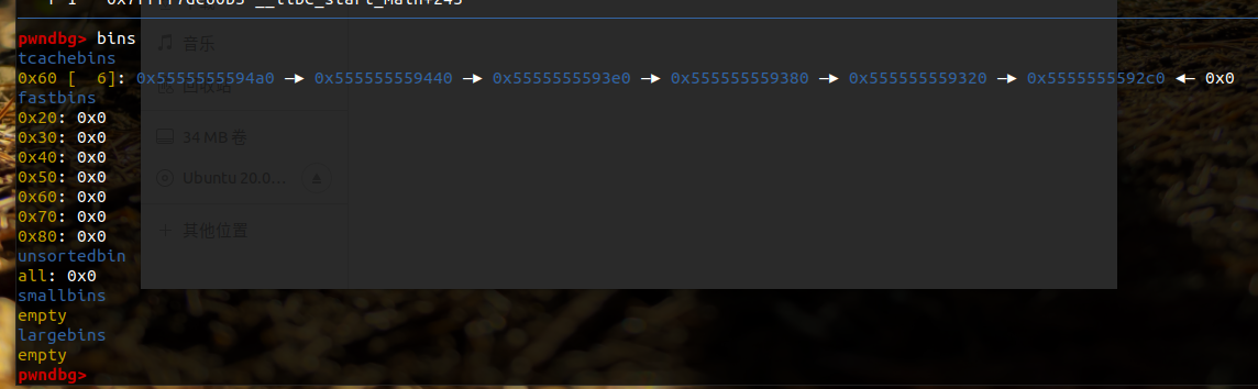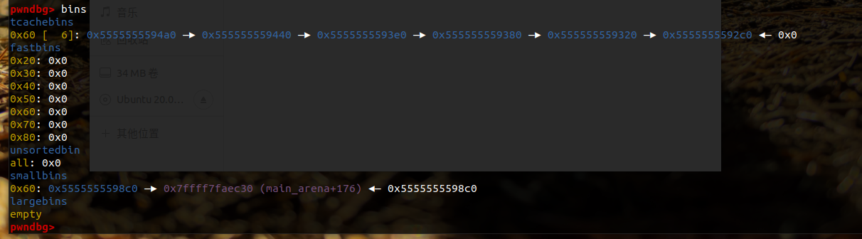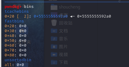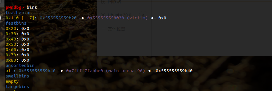 - 再重复构造一个同样 size 为 n 的堆块进入 small bin 后,修改该堆块的 bk 指针为 目标地址-0x10