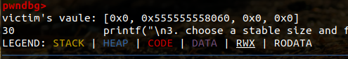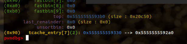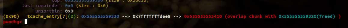 - 申请一个大于 size 的堆块,此时可以通过该堆块完成对 b 堆块的覆盖,并且 b 堆块仍然在 tcache 里。