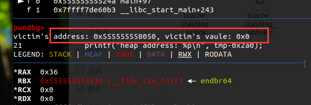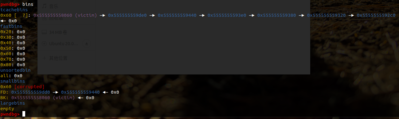 再使用calloc申请size为0x60的堆块,此时victim也将被放入到tcache中。
